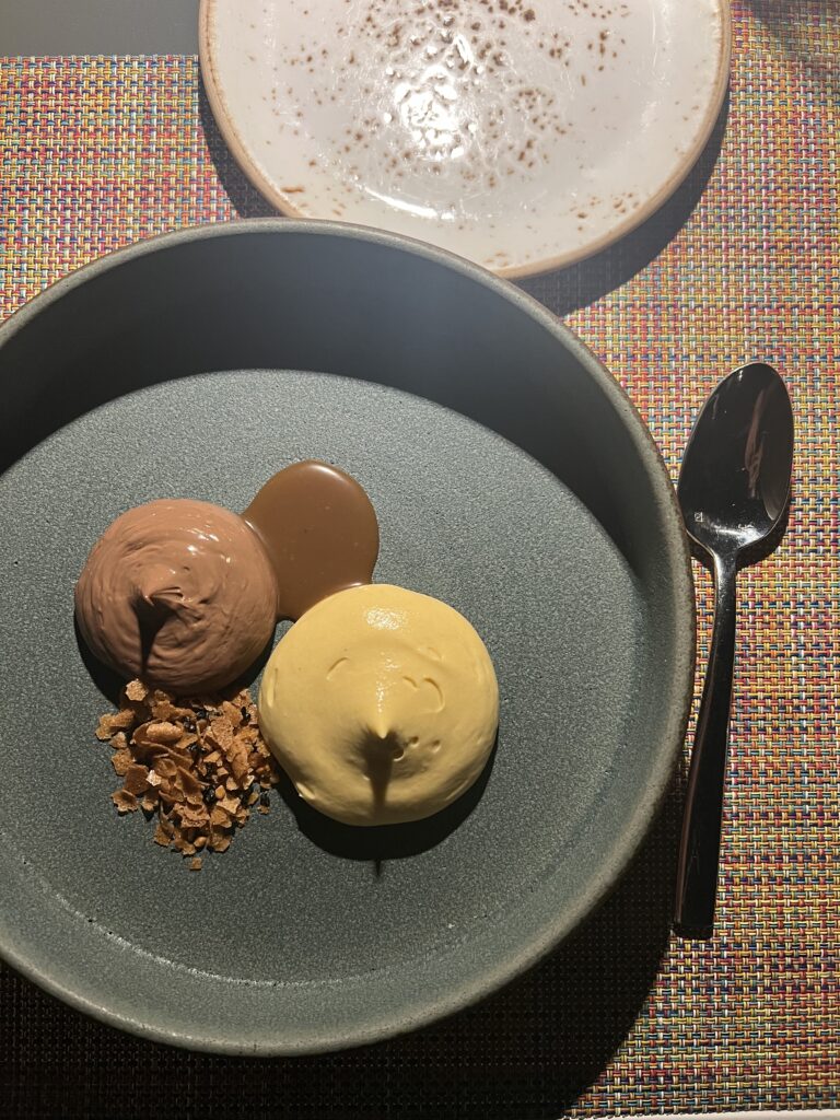 Desserts aren’t an afterthought in Peru; they’re an essential element of the country’s traditions. While Mexico gets the credit for introducing cacao to the West, chocolate continues to play an important role in Peruvian culture. So for a last course, we ended with the lucuma + chocolate, a light mousse that combines Peruvian chocolate and lucuma, a sweet and citrusy fruit native to Peru. It’s topped with caramelized sesame and hazelnut to give the dish a satisfying crunch.