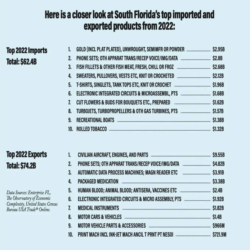“The products that lead Miami exports are things like aviation and technology, medical-related exports… These are all high-end, high-tech, high-value exports, and Miami seems to be doing very well as an exporter of those products,” Mencia says.