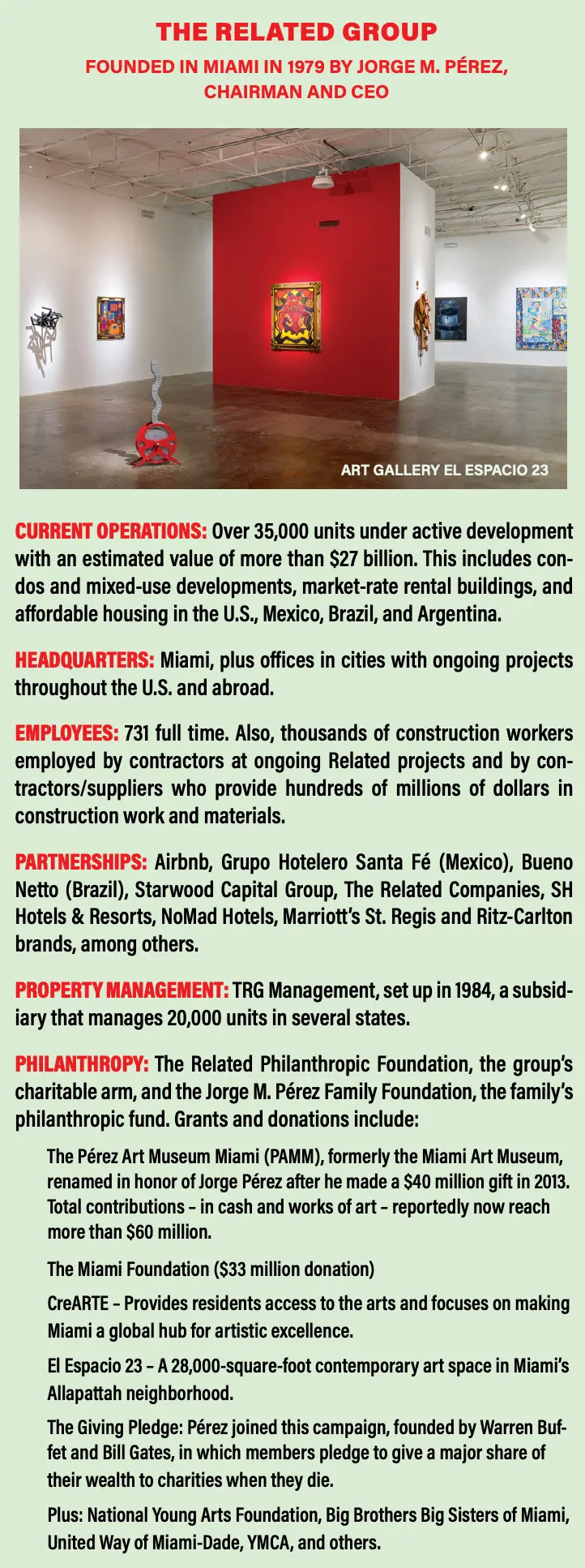 Today, he is a billionaire and heads one of the largest real estate development firms in the country. Pérez is the chairman and CEO of the Related Group, a privately owned global real estate company he founded in 1979. Forbes’ 2023 list of the richest people in the world pegged Pérez’s net worth at $1.7 billion. He has overseen the construction of more than 100,000 luxury and affordable residences – some 17 million-square-feet of real estate – selling properties worth more than $50 billion.