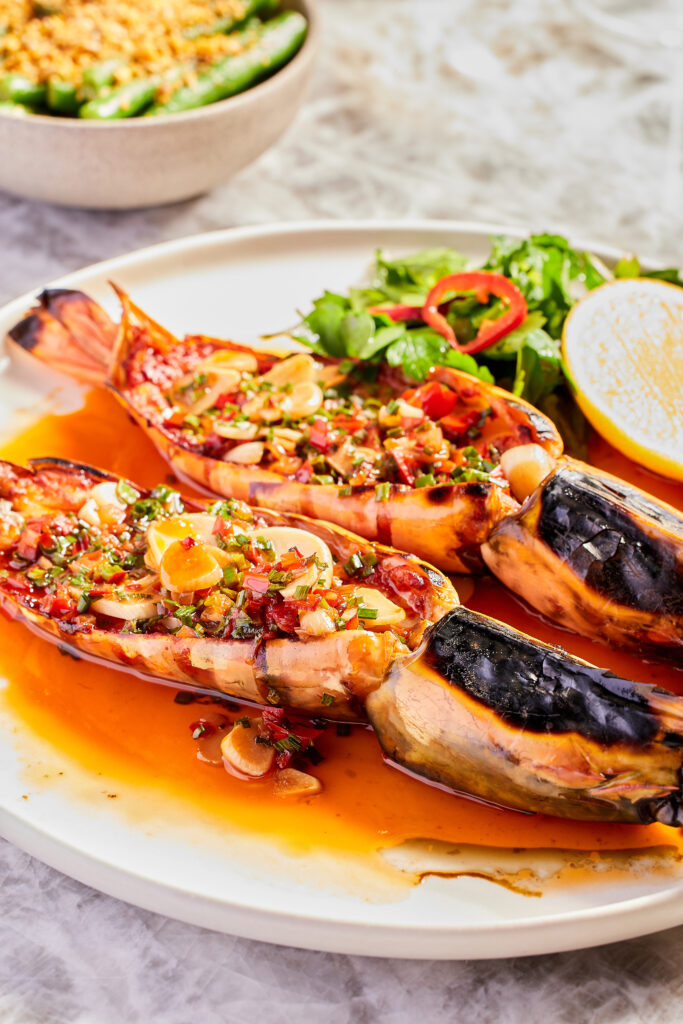 In addition to the kabob, we tried three other entrees. The grilled king prawns ($38) were served in their shells, and looked like small lobsters, the taste profile enhanced by fermented garlic. The prime rib eye (14 oz, $68) could not have been better, perfectly grilled on an open flame. But the showstopper was the whole branzino ($55). It was deboned and served with head and tail on, covered with fennel, Fresno chili peppers and bits of sauteed onion, having first been charcoal grilled. What put it over the top was a slather of creamy Moroccan garlic harissa paste in the deboned cavity.