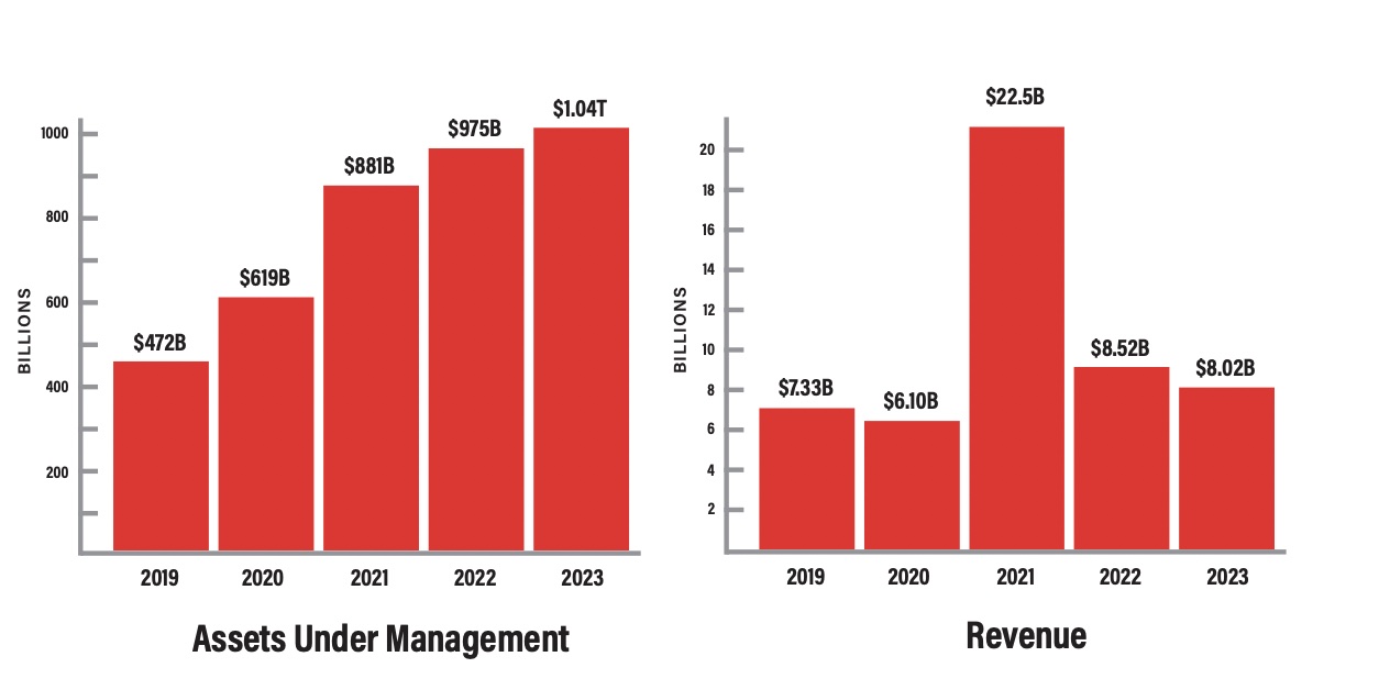 Next down the list is the private equity segment, with $310 billion in assets under management and 126 portfolio companies in such categories as life sciences, infrastructure, and energy, companies like Ancestry, Phoenix Tower International, and Copeland (previously known as Emerson Climate Technologies). Another private equity category is “tactical opportunities,” the edgier investments in new technologies, companies like Cryoport (bio logistics), Core-Weave (cloud infrastructure powering AI) and ARKA (advanced military and space technologies).