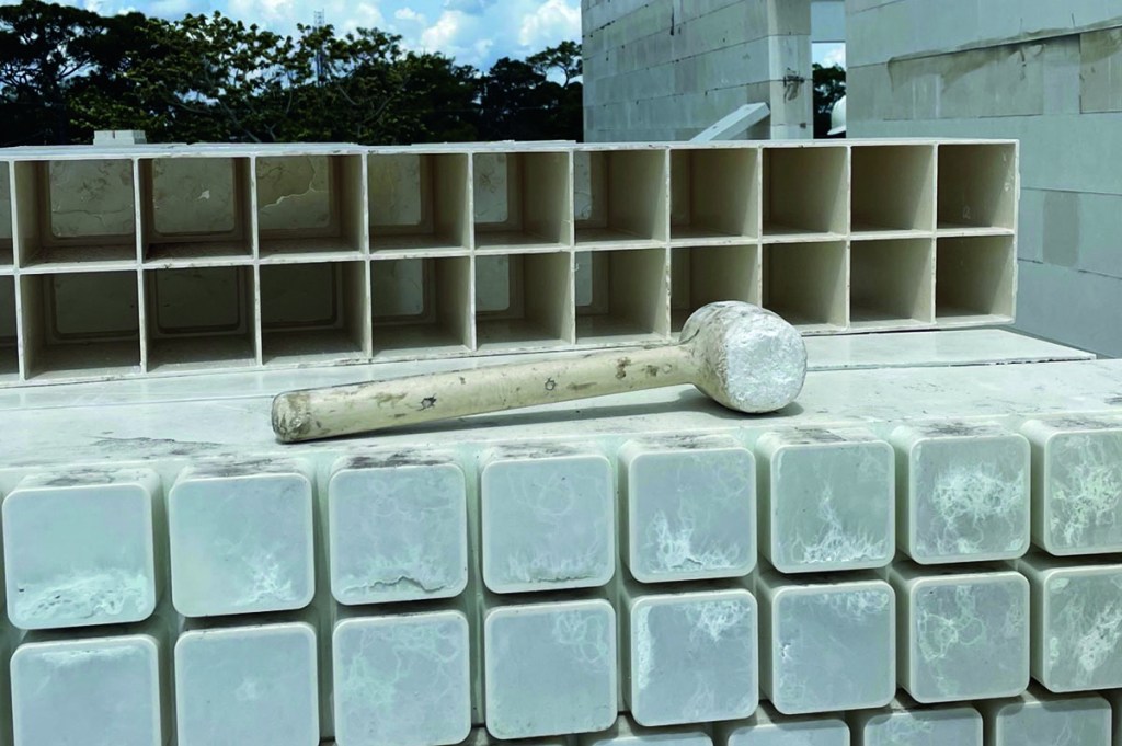 Founded in 2012 by Thomas Murphy Jr. (the founder of Coastal Construction) and Engin Yesil, a Turkish investor, RENCO USA has undergone more than 400 tests over twelve years for U.S. building approval. “RENCO is the fourth way to build in the world,” says RENCO USA’s managing director (and Thomas’ son) Patrick Murphy. “If you’re looking at the developed world, you have metal, you have concrete, and you have wood. Those are the three structural systems that you can build with, but now RENCO is the fourth-ever approved by the International Building Council for the US.” Short for renewable composite, RENCO’s blocks are made of repurposed glass fibers, resin, and stone.