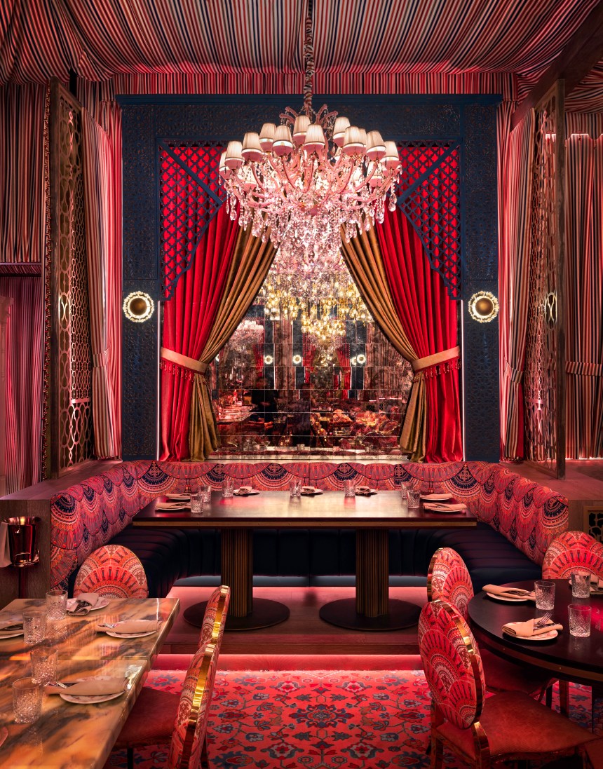 The entrance sets the tone. A 30-foot red carpet leads to a space framed by Moorish design elements and greenery, a nod to the ornate architecture of Morocco. Inside, the décor leans into retro luxury: pink and teal hues, velvet booths, silk draperies, and Turkish rugs, all tucked within a tent-like structure reminiscent of the riads of Marrakech. The influence is clear—a modern Riviera take on the Maghreb, with just enough glamour to match Miami’s buzzing social scene.