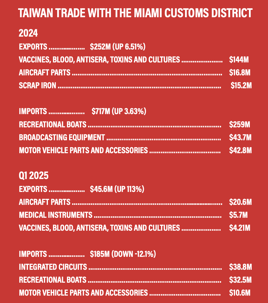 On the import side, Taiwan continues to anchor Miami’s trans-Pacific trade flows in both consumer and industrial categories. Imports into the Miami Customs District reached $717 million in 2024 – up 3.63 percent from the previous year. Recreational boats led at $259 million, followed by broadcasting equipment ($43.7 million) and motor vehicle parts ($42.8 million), reflecting Taiwan’s strength in niche manufacturing. Yet in the first quarter of 2025, imports fell to $185 million – a 12.1 percent decline compared to the same period last year. While global supply chain normalization played a role, analysts also point to sourcing adjustments related to ongoing U.S. tariff policy, which is encouraging shifts in inventory planning and trade routing across Asia.